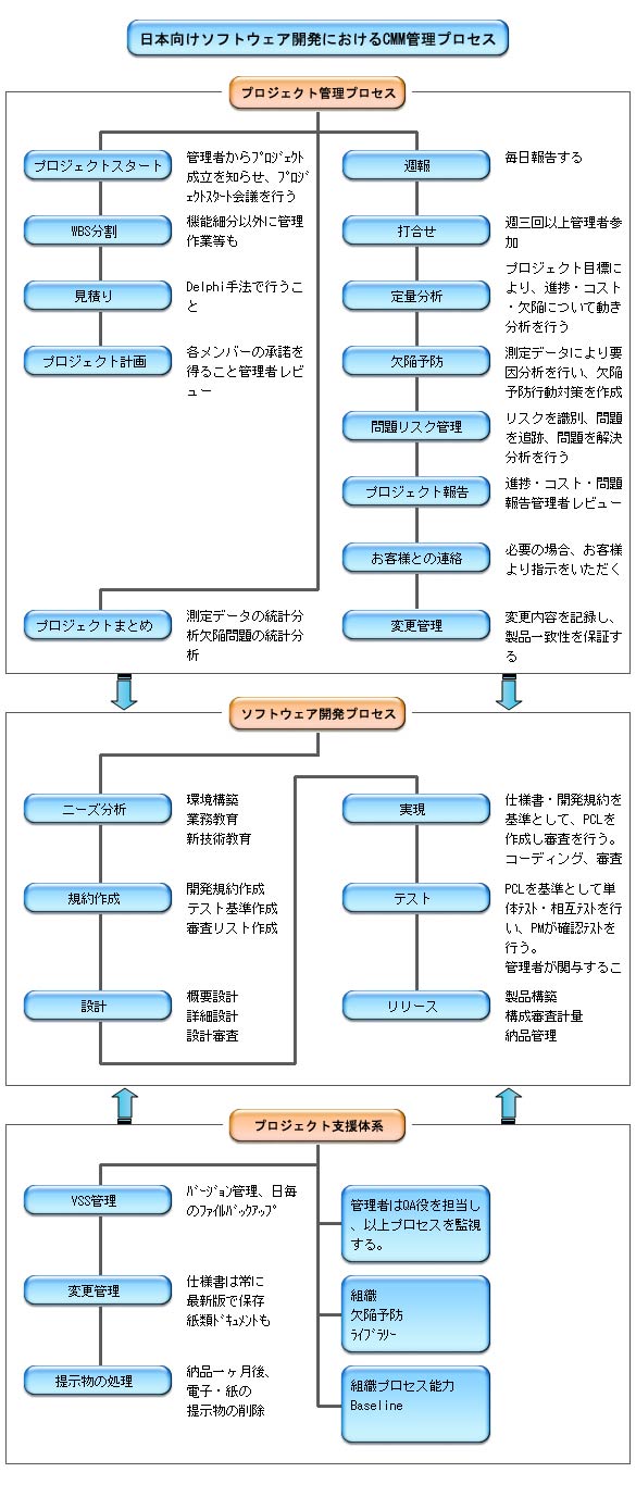 | CMM(Capability Maturity Model):プロセス能力成熟度モデルで、5段階の成熟度から成ります。 |